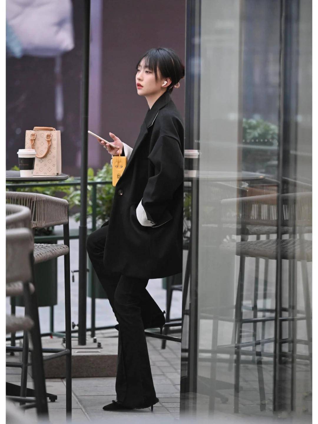 一身all black 的穿搭簡約大方又酷酷的,一點都沒有嗅到黑色沉悶的氣息:寬大的oveizeize、翻起的袖筒、喇叭褲腿以及針形細高跟……每個細節都散發著時髦氣息;