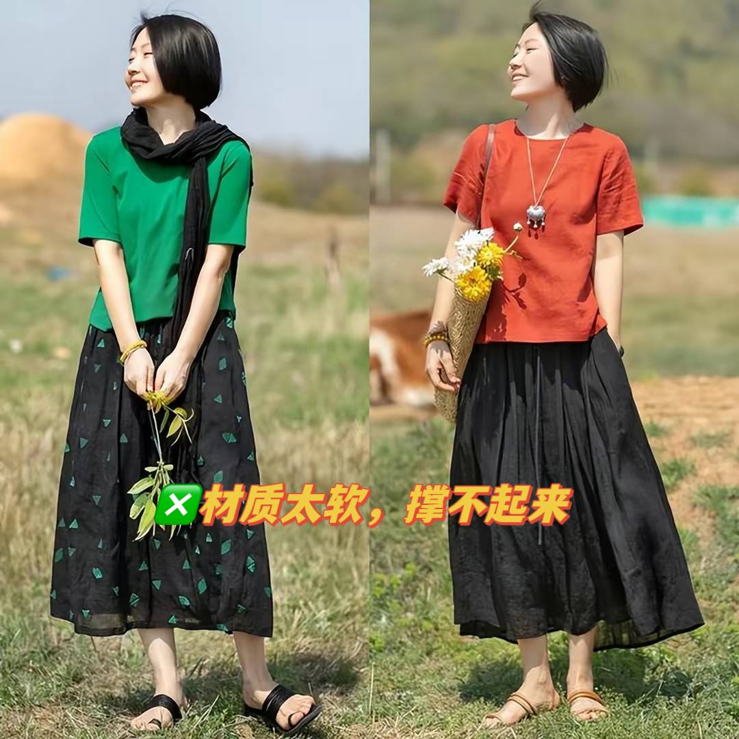 穿傘裙注重挺闊感,如果你挑選的傘裙材質皺巴巴的,那我們就要避免哦。像這種皺巴巴的料子最踩雷的地方在于廉價感十足,皺巴巴的材質穿在身上大面積的鋪開,就會顯得整個造型都非常的廉價,沒品味,不管你身材多好,氣質多麼出眾,穿上都會感受到它的不友好。