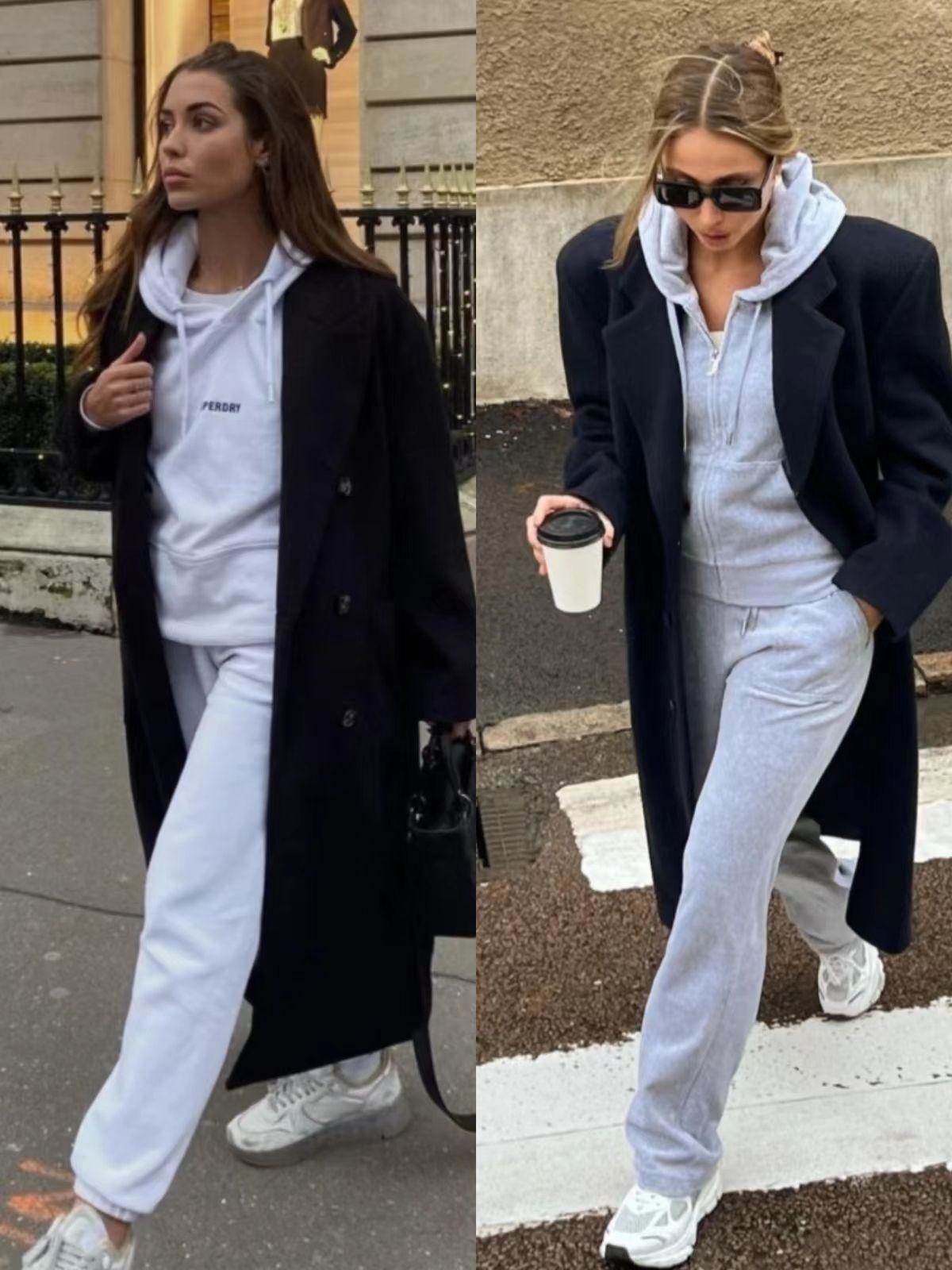 帽衫就是最好的選擇,連帽衛衣休閑隨意,遇見嚴謹穩重的黑色長大衣,輕松碰撞出火花,簡約個性又極具時尚調性,是時髦精們出街最愛的搭法之一!