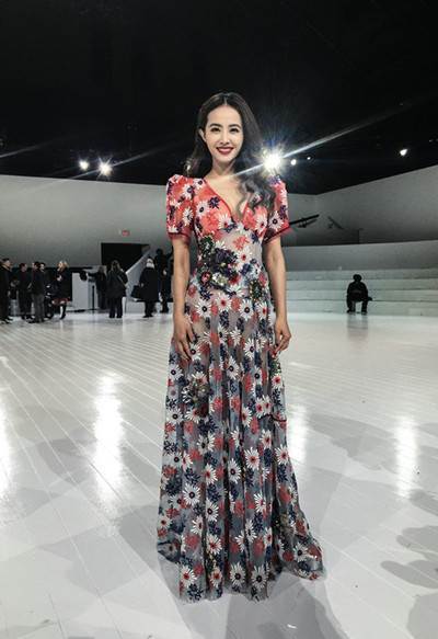 Jolin一身印花長裙,深V露出傲人的事業線,分分鐘一米八的既視感,既性感又有氣場。溫婉的卷髮搭配精緻的妝容,盡顯女神氣質。小個子的寶寶在選擇裙子時,要麼長,要麼短,一定要避免尷尬的長度哦!