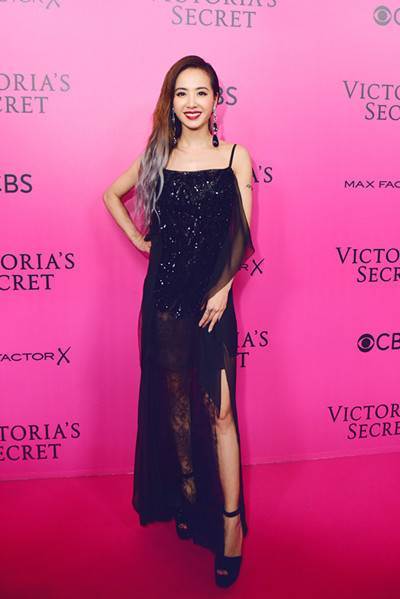 小黑裙可是出席各種場合的必備,jolin一身吊帶蕾絲長裙,若隱若現的小腿,給人一種朦朧美,女神范十足。開叉的設計視覺上拉長了腿部的線條。小個子的寶寶可以選擇開叉款哦!