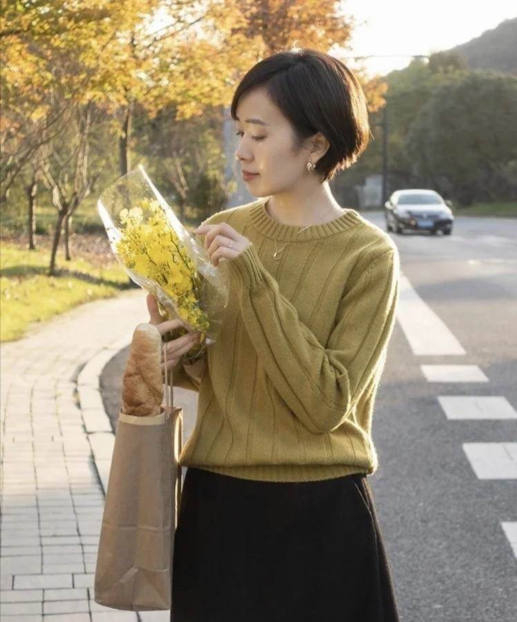 像這款芥末黃色的圓領針織毛衣,它自然是到了秋天之后會格外受歡迎且有著高的使用頻率的存在。顏色帶來的亮度不會高,搭配黑色褲裝或者是裙裝,就很方便且很得體。