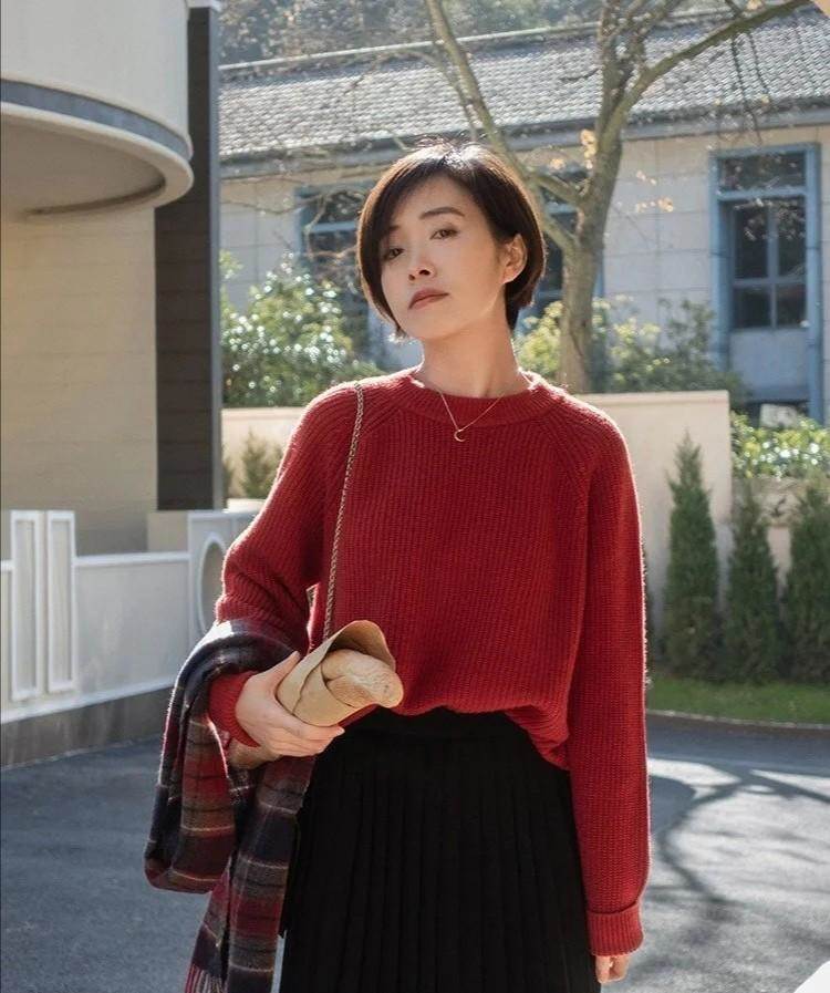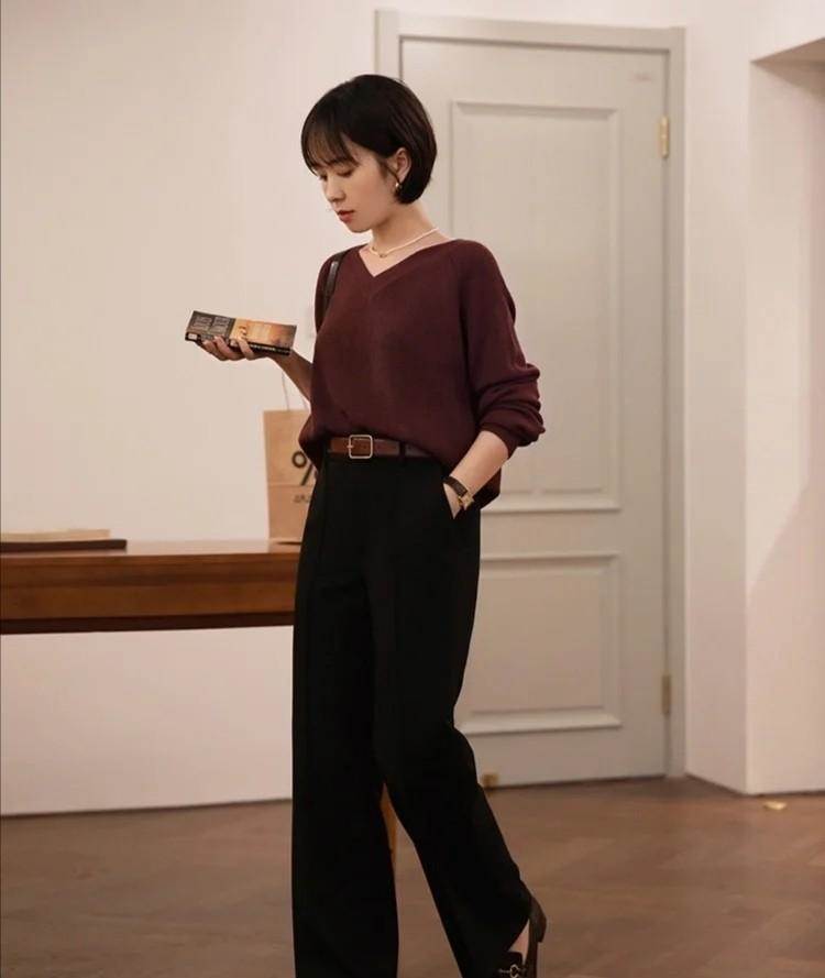 不過,紅色單品的亮度并不是統一的,像這款暗紅色的V領針織毛衣,它就會保留略微暗沉的風格,下半身匹配基礎的黑色長褲,也很和諧,對雙腿沒有要求。