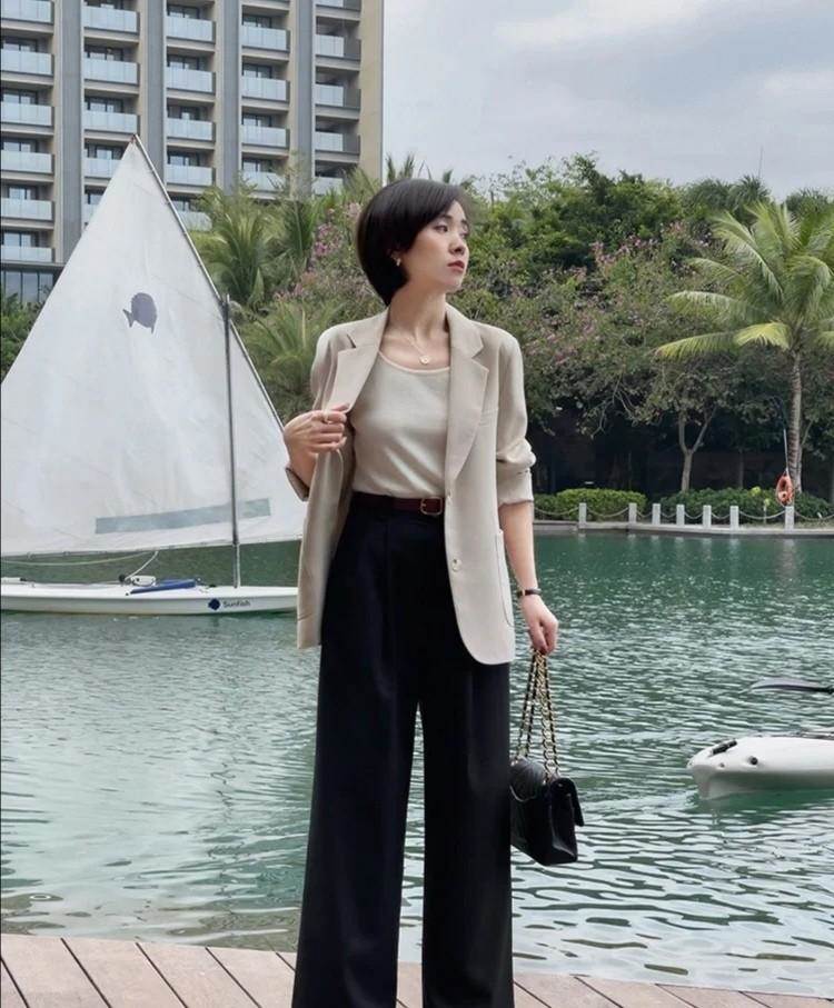 像這件淺色的小西裝,它就能夠讓女性走出校園之后,以一個良好的精神面貌融入社會之中,融入職場之內,顏色的選用確實比較簡單,而在服裝的配合方面,就更加沒有難度。可以搭配一套同色的T恤或者是襯衫,再結合一款垂感不錯的黑色褲裝,就能從縱向讓腿型得以修飾。