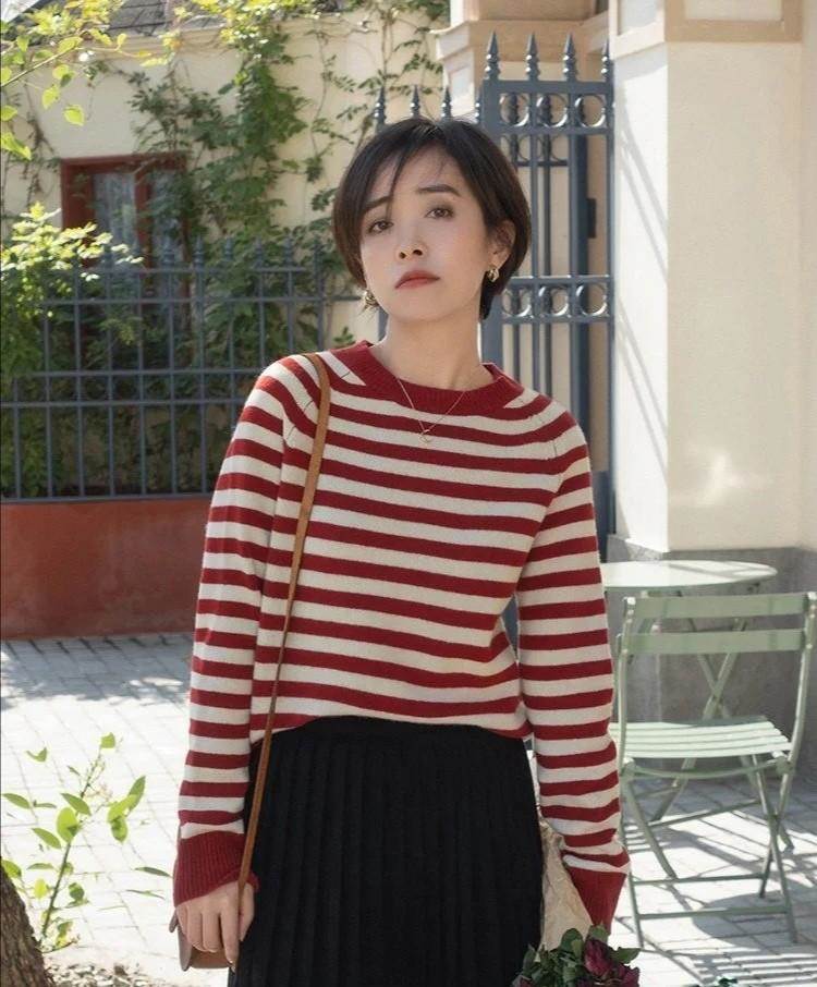 這件條紋針織毛衣采取的是紅白兩色的配合,剛好能夠稀釋紅色過高的駕馭難度,在下半身匹配黑色的過膝半身裙,也頗有一種溫柔又優雅的美感。