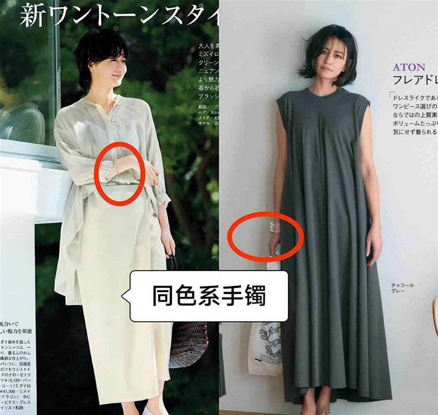 左邊這套米色搭配和右邊的煙灰色長裙都搭配了同色系的手鐲,這不比穿金戴銀更有氣質?
