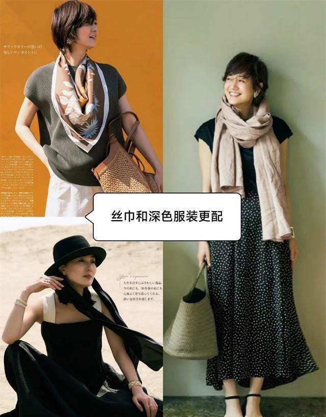 你可別以為絲巾是只有老大媽才會選擇的單品,富岡佳子最喜歡用深色長裙和絲巾搭配,別提有多好看了!