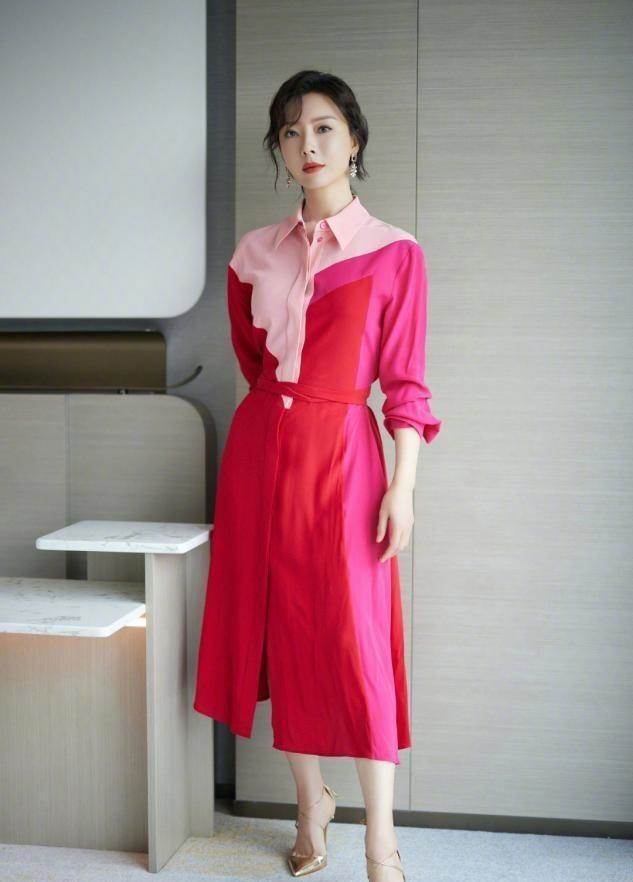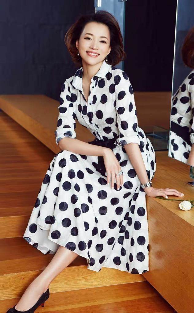 中年女人在穿裙裝的時候,如果想要突出優雅感,建議從配色上做突破。盡量保持整體顏色的一致性,用同一種色系來增加整體感,和諧自然,優雅洋氣。像董卿這樣穿,簡約的波點裙配黑色尖頭鞋,鞋子與圖案之間的顏色呼應,穿起來格外優雅洋氣。