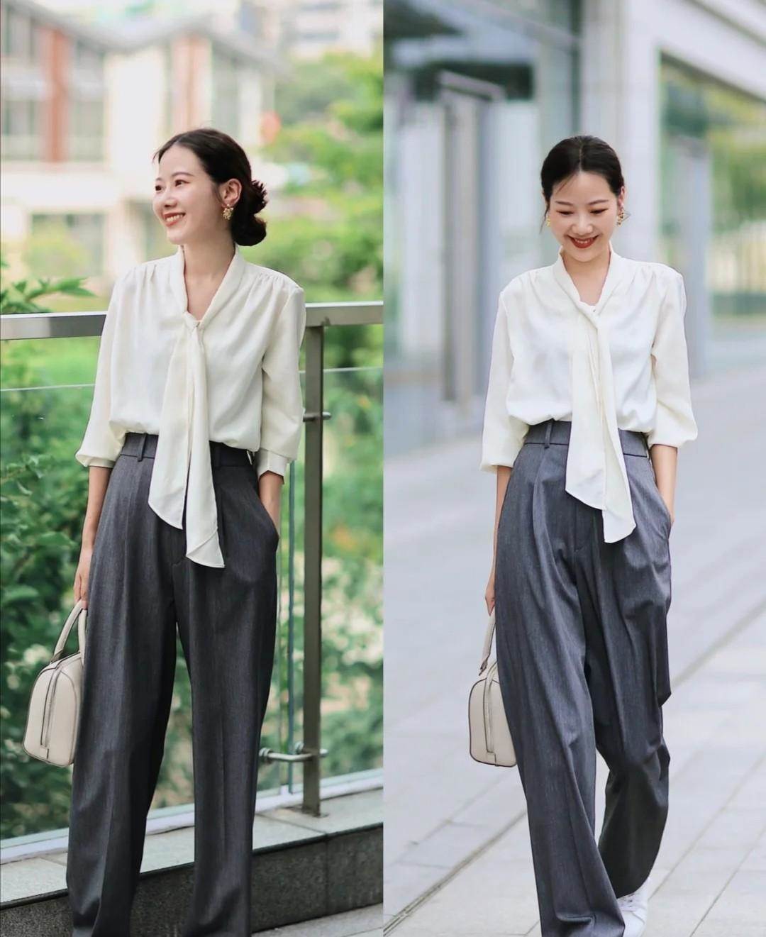 白色襯衫帶有長飄帶的銜接,因此它散發出來的靈動氣息會更足一點,去除原本襯衫的呆板感。這款襯衫單品可以搭配出可正式可休閑的風格,如果結合寬松一點的灰色闊腿長褲,姿態瀟灑又帶有幾分隨性感。
