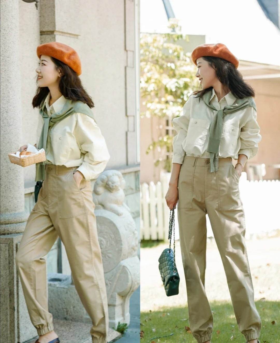 白色襯衫搭配的是卡其色的束腳運動褲,這種褲裝單品呈現出來的休閑格調更加的明顯,因此可以穿出十分隨性的風格,在肩膀的位置加入薄荷綠色的披肩,也很有時尚感。
