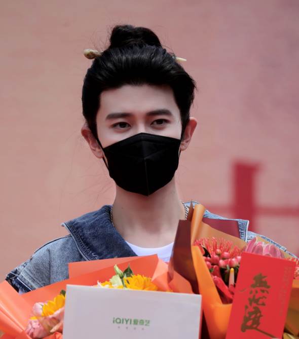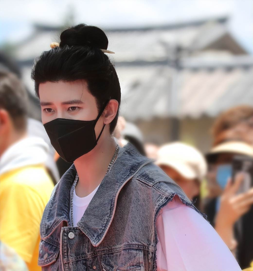 《無憂渡》開機路透圖中的任嘉倫穿著現代裝頂著古香古色的道士頭,將頭髮全部梳上去露出他完美的發際線和精致的眉眼來。