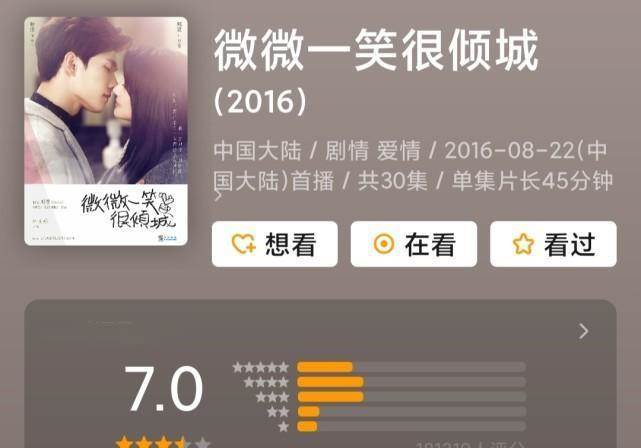 鄭爽和楊洋主演的《微微一笑很傾城》評分7分,排名第4。