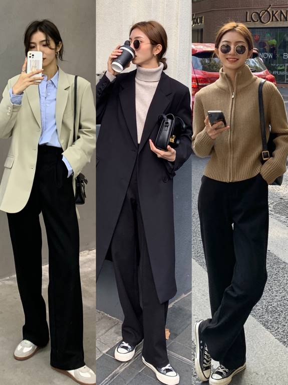 第四條是闊腿西裝褲,都知道西裝面料質感好,而且垂墜感強,它的優勢就在于穿在身上非常有利于拉伸我們的比例。