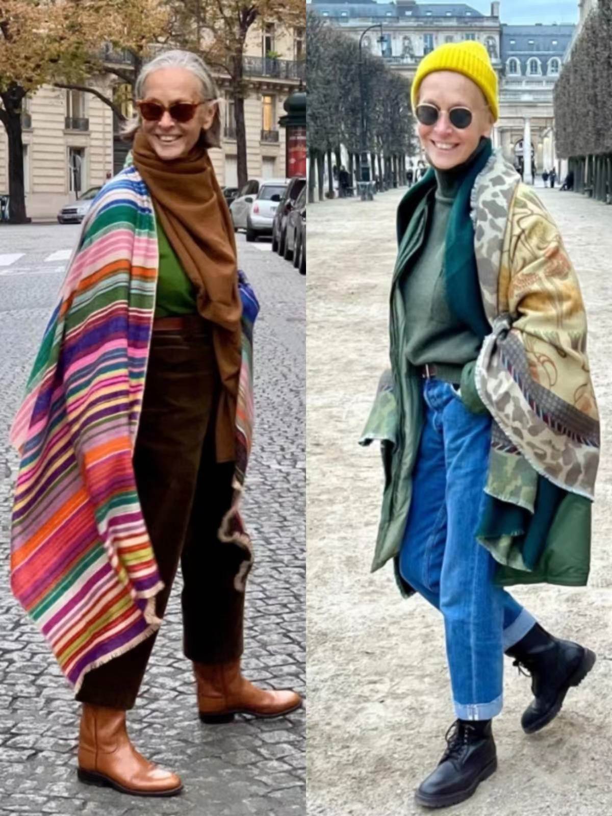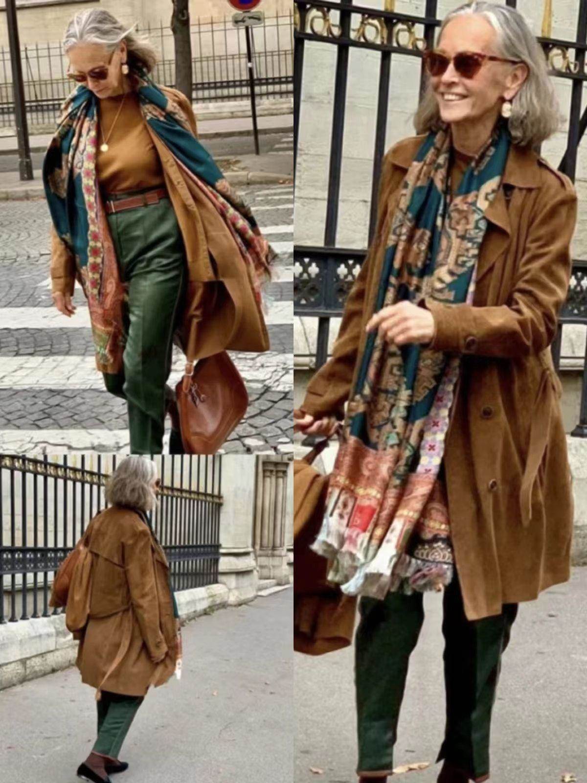 像這位巴黎奶奶穿大衣配毛衣、牛仔褲時,會銜接平底鞋或者平底靴,加入一款印花披肩,氣質分分鐘得到提升。