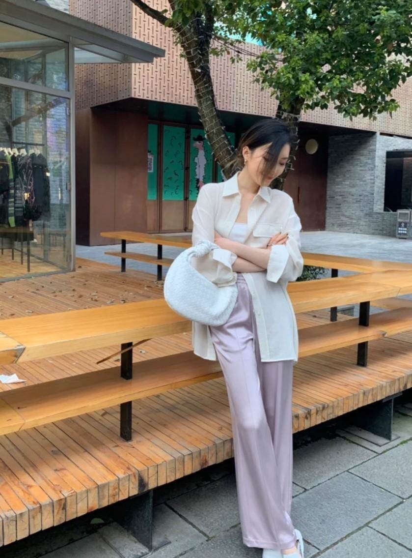 醋酸褲的面料就像絲綢、真絲觸感一樣的,但又要比真絲的垂感更重一些,搭配出來的身材肯定更具拉伸力的,視覺上的高級感更是絲毫不差,尤其是3、40歲的女人,穿起來絕對是氣質翻倍的效果。