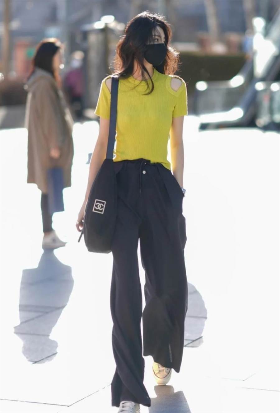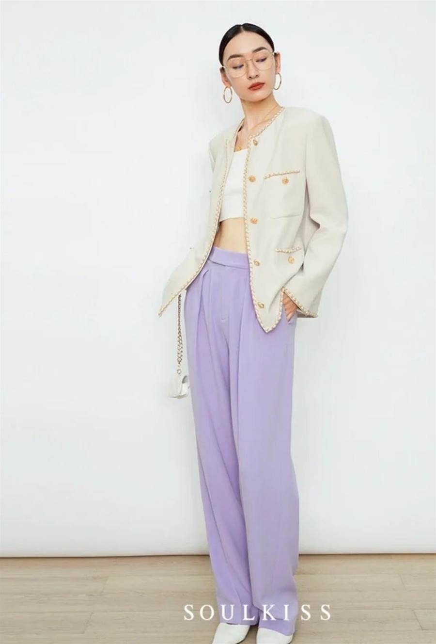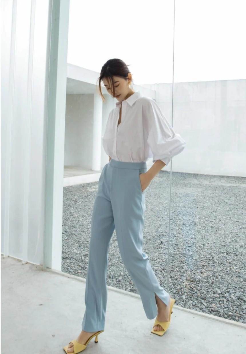 褲管的長度推薦大家兩個選擇都可以起到拉長下半身的效果,第一個就是自然拖地的長度,直觀明顯的對腿部顯長,第二類則是八九分的設計,將腳踝曲線展現,分割腿型的比例讓其更顯長。