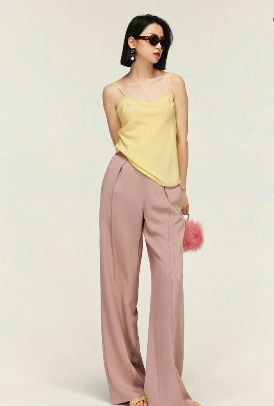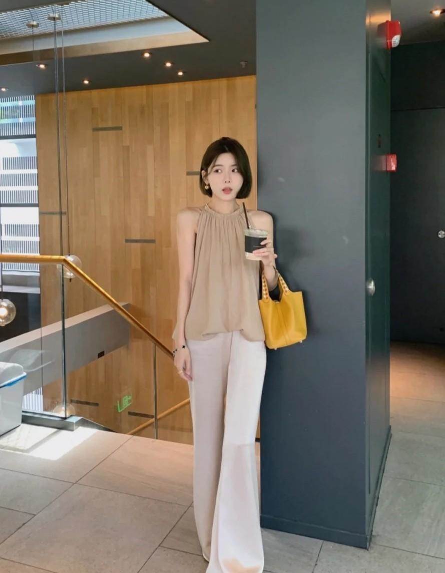 醋酸褲的搭配呈現的效果會將整個腿部都遮擋起來,所以在天氣比較炎熱的時候,建議大家的上身可以選擇搭配露膚面積較多的上裝,從上至下展現一定的露膚性,在視覺上更顯協調和舒適性。