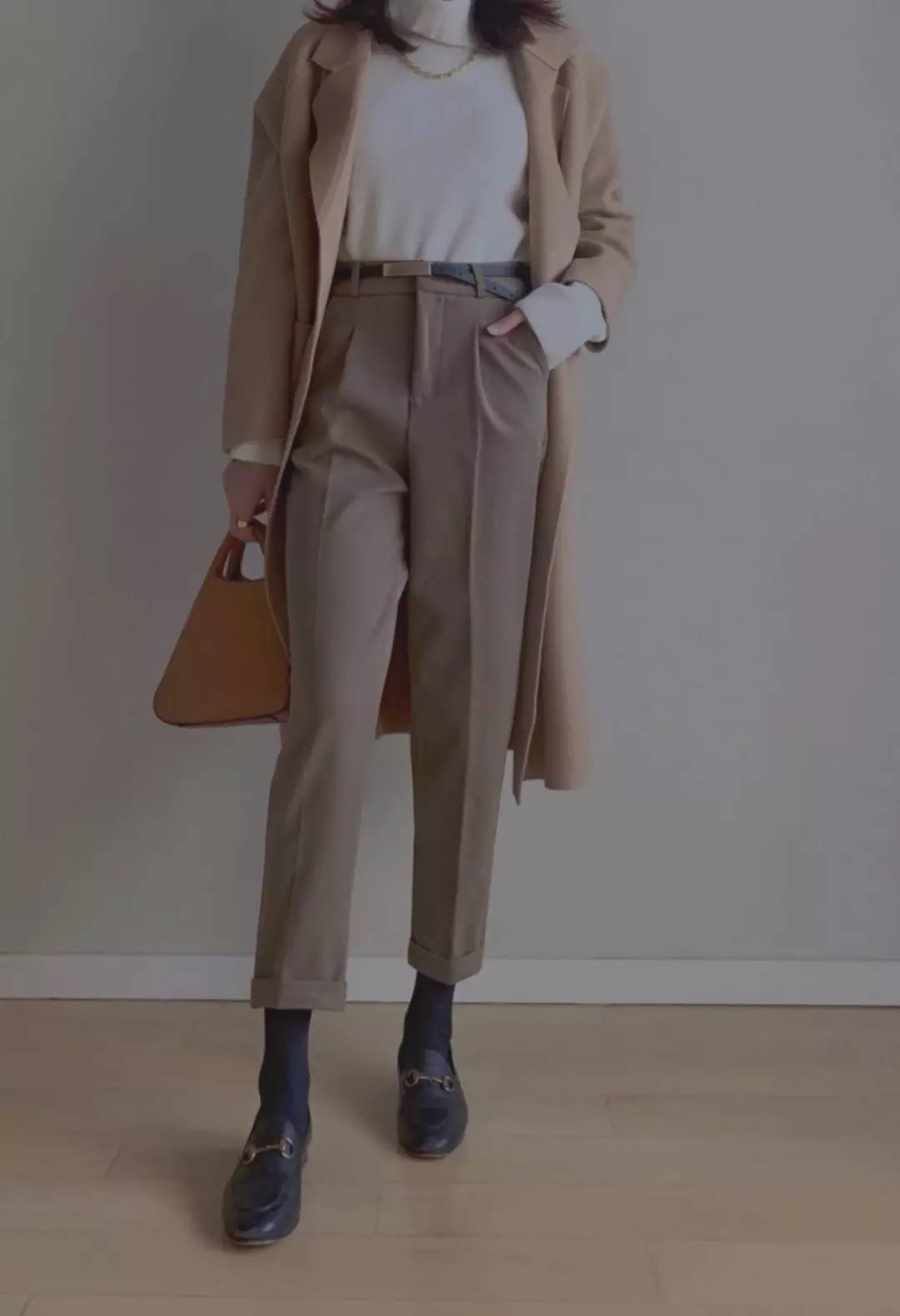 高領毛衣+煙管褲+樂福鞋,作為單獨的一套造型或者作為陪襯的內搭都很合適,唯一需要注意的是上衣的版型,搭配樂福鞋時最好不要用長款上衣,會顯得邋遢,有這種情況一定要賽褲腰才好看哦。