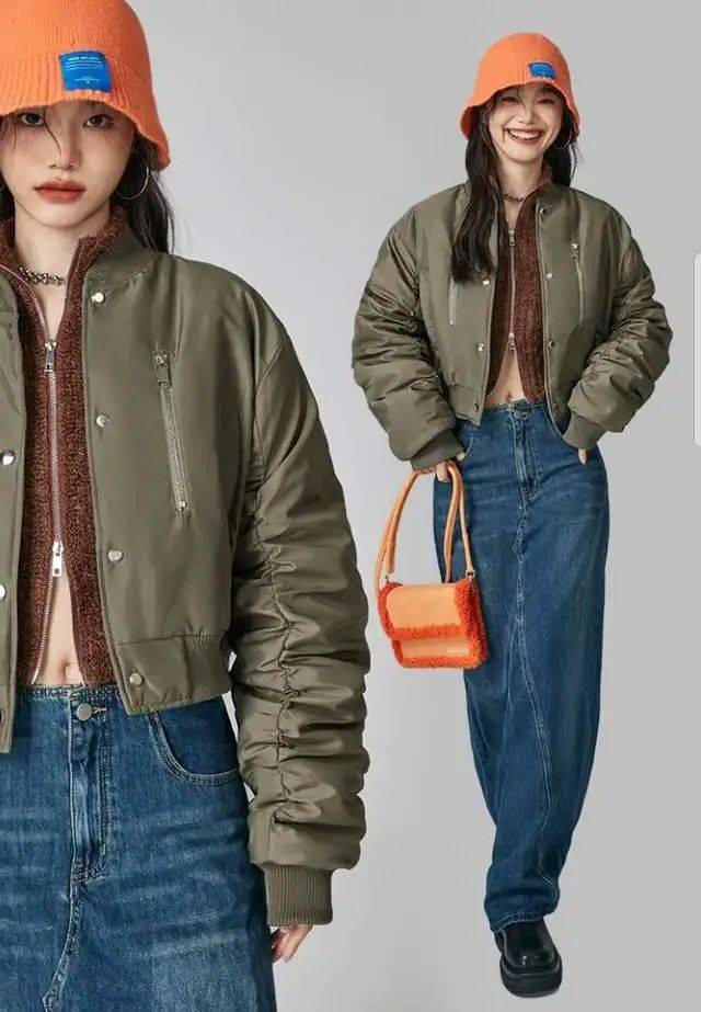 在搭配棒球棉服這款單品的時候,真的非常推薦各位小個子的女性優先于搭配短款、高腰的設計哦,完美的提高腰跡線的比例水平,也可以與裙裝搭配起來的時候將身形比例的標準化和優勢完美的凸顯出來。