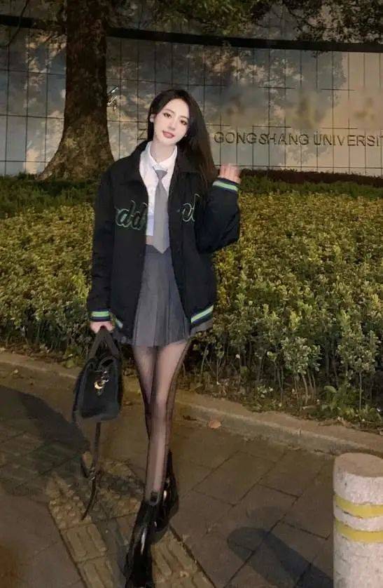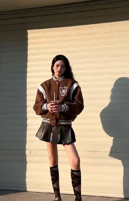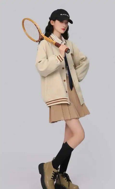 再搭配短裙和棒球棉服進行組合展現的時候,建議大家能夠優選厚底鞋、增高一類的楔形搭配,直觀的將下半身的流暢和纖長感的優勢進行拉長和強調化的處理哦。