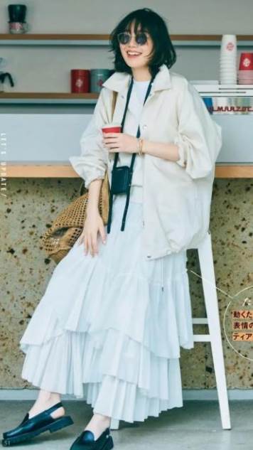 因為衣服都沒有款式可言,她們通常選擇較為普通的上衣配不規則的長裙,大擺裙是她們選擇最多的版型。遮肉顯瘦,有一定分量使重心保持在下方,就會顯得頭小身軀嬌小。