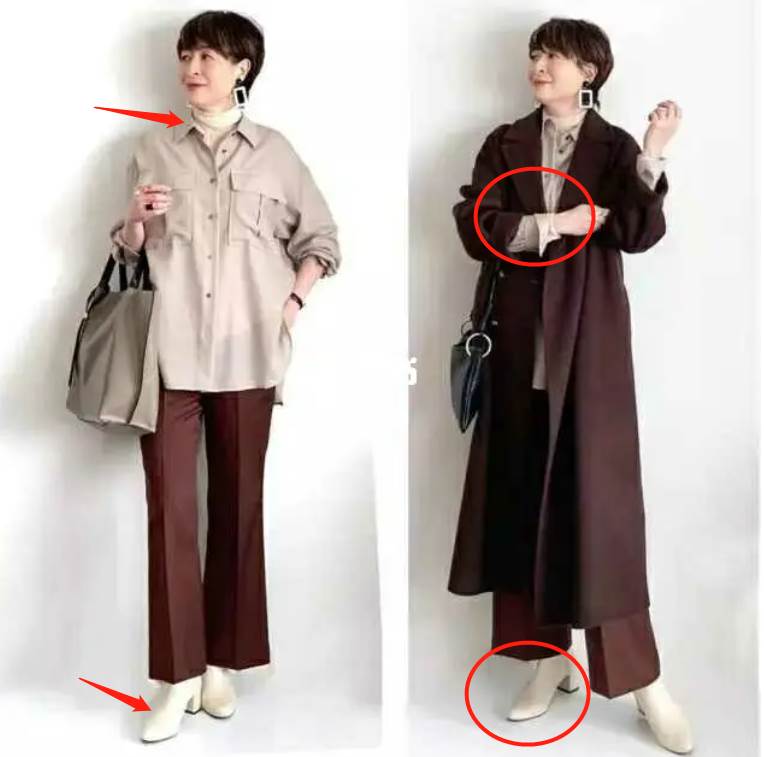 秋冬厚衣服顏色淺容易顯胖,不得不以沉郁為基調時,她們會通過局部淺色的點綴來提亮整體。通常是采用上淺下深的方式,避免造成頭重腳輕。
