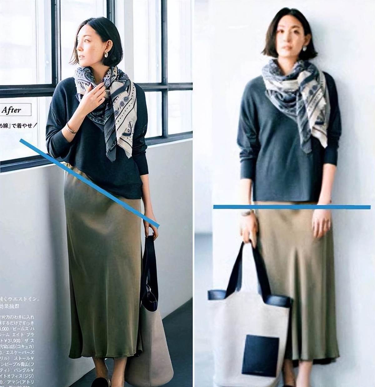 身形瘦高的直接從領口下手露出鎖骨,頸部線條詮釋一切。而梨型身材或是蘋果身材,則腰腹無曲線,蓋住膝蓋以上,腿細的露出小腿,粗一點的再穿一個小腳褲只露腳踝,分層對比,會讓人直接以最纖細的部位來進行判斷。