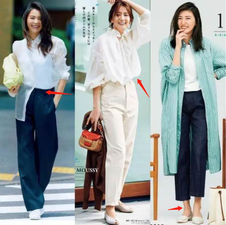 修身版:衣服通常較短,沒有過多花紋,褲子高腰到肚臍以上,褲腳蓋住腳背,比例三七開。若是連衣裙,在胸部以下就開始收腰,營造九頭身氛圍。