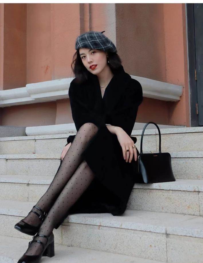 性感和甜美的碰撞,滿滿的法式高級感;黑色的絲襪具有的顯瘦效果可以讓腿型變得更好看些,鞋跟的高度,外搭一件大衣剛好能彌補身高的問題,整個人看起來嫵媚勾人充滿女人味。