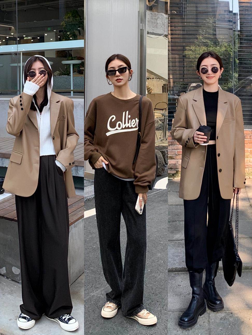 上半身穿咖色,下半身配黑色,這種經典造型姐妹們也都可以學起來,在秋日可以選一件咖色西裝或者是一件咖色的衛衣,低調成熟又時髦。