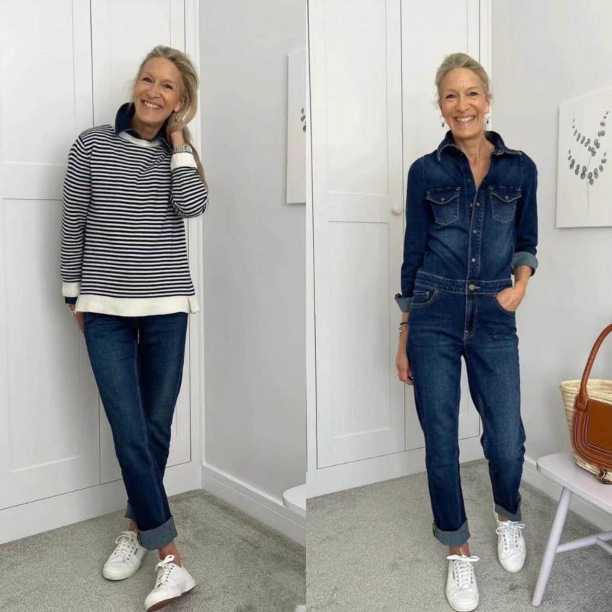 藍色牛仔褲、白球鞋都屬于典型的基礎款,大方得體又舒適,到了秋天將它們組合在一起,匹配條紋衫、襯衫、牛仔上衣或者各種外套,都很時尚得體。