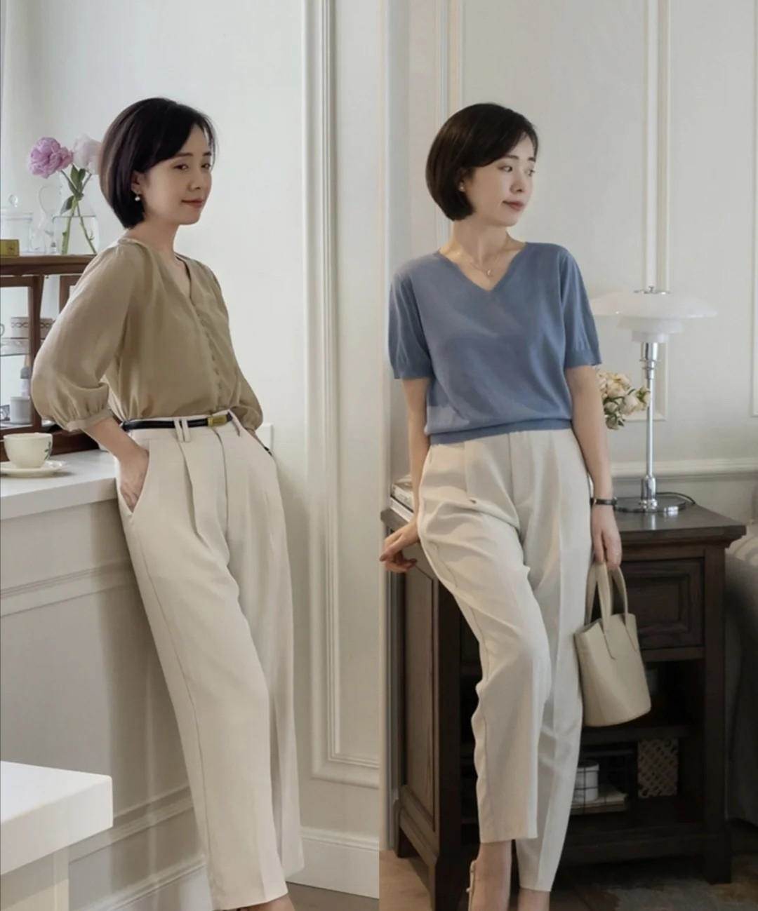 在下半身,可以組合各種利落的褲裝,當然,寬度的選擇跟女性的腿型有關,如果雙腿稍粗,可以運用闊腿褲或者是直筒褲進行修飾。