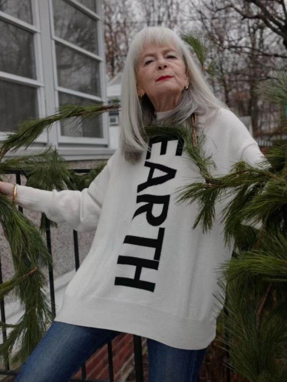 對于一些身材嬌小的白發奶奶,也可以用微廓形衛衣或者針織毛衣匹配藍色緊身牛仔褲,慵懶休閑又隨意自在。