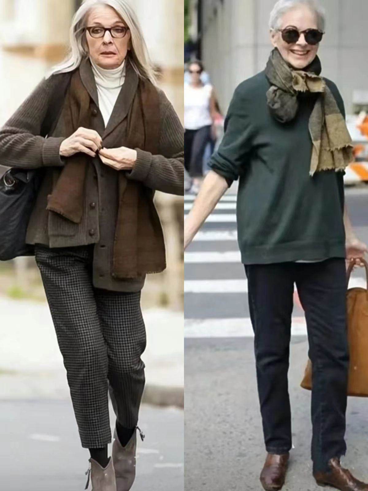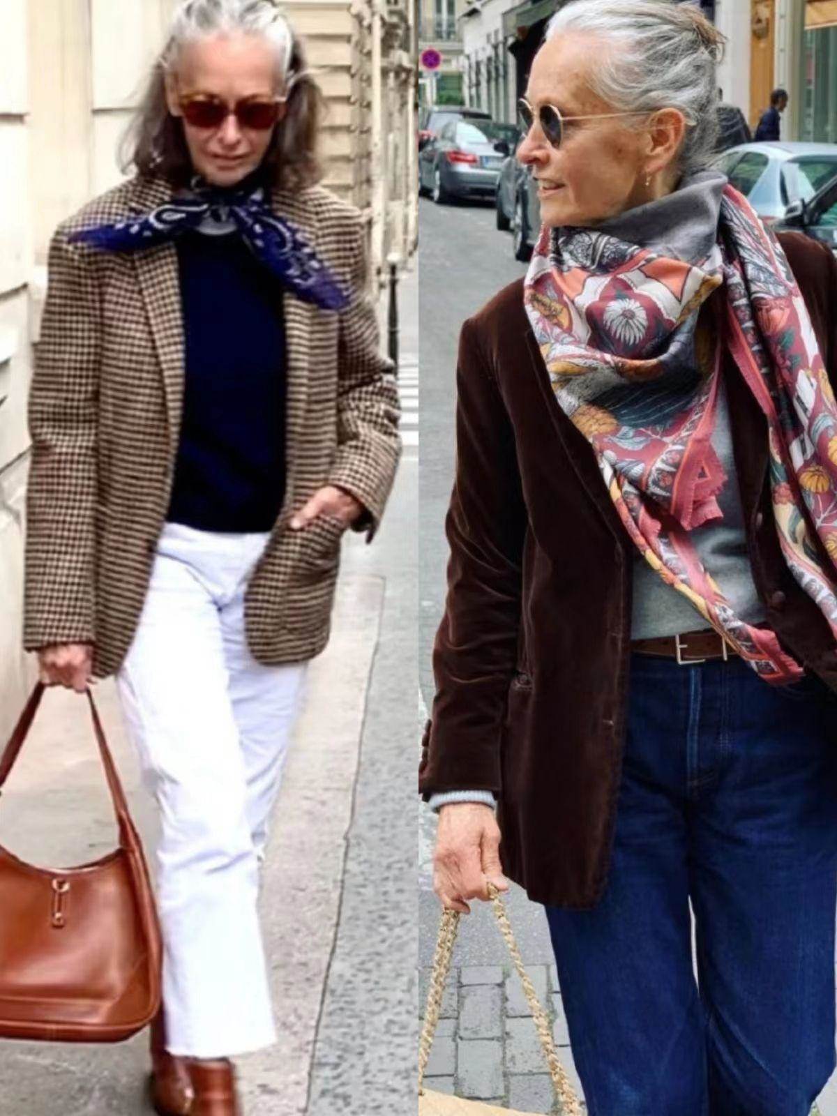 國外奶奶到了70多歲,依舊熱愛絲巾,復古保暖的西服造型有了絲巾加入,更添柔美與精致。