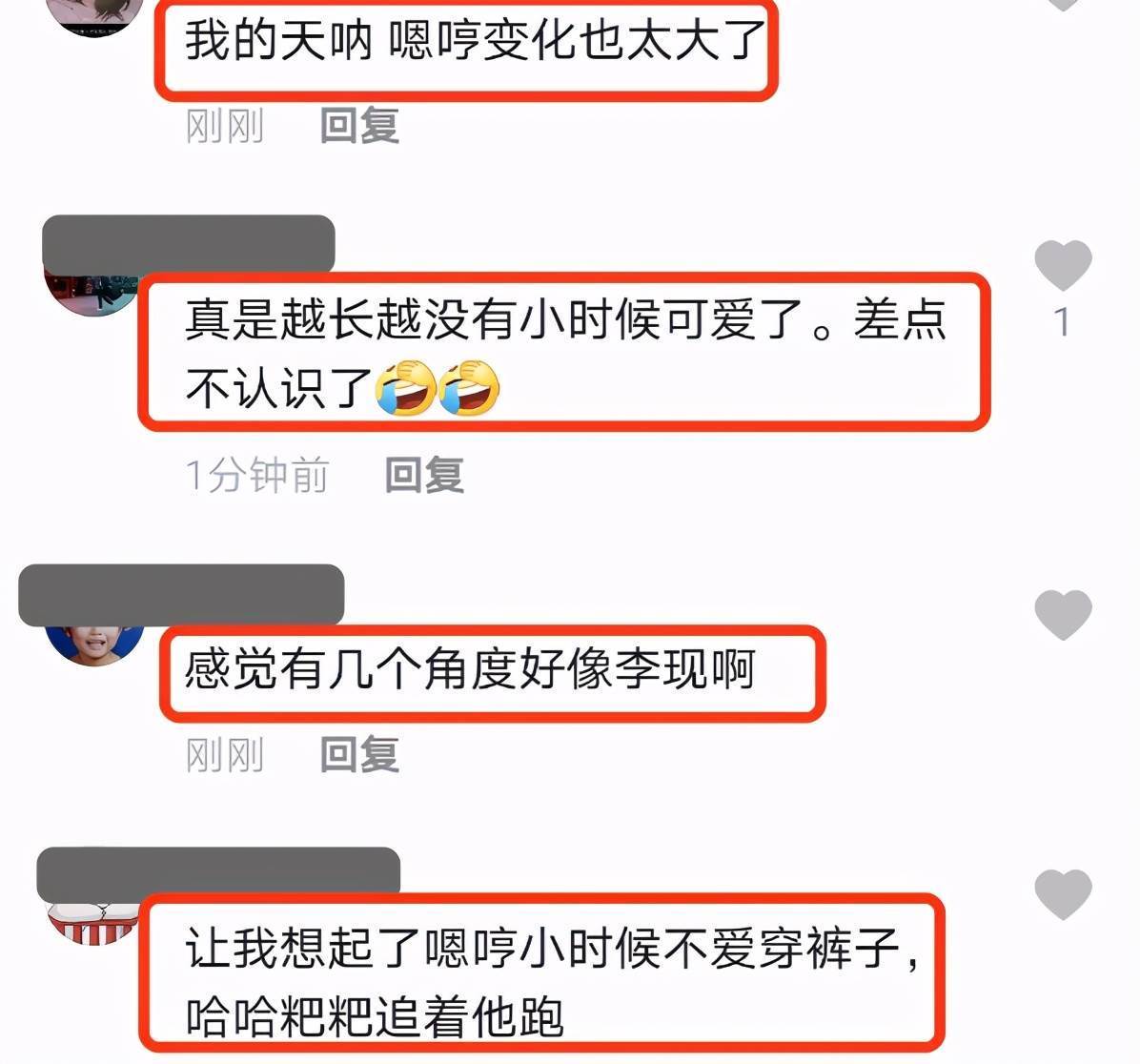 也有網友覺得嗯哼長得像李現,或者說嗯哼不如小時候那麼可愛了,快認不出來,更有小夥伴想到了嗯哼參加《爸爸回來了》的時候不愛穿褲子,杜江追著他跑的畫面。