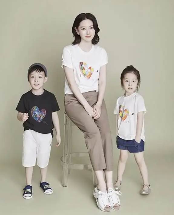 圖中,李英愛選擇白t+卡其色直筒褲,女兒則是同款白t搭配牛仔短褲,兒子選擇同款不同色的t恤+白色七分褲,三人搭配都走簡約風,同款的t恤強調整體感,t恤上的印花設計打破單調,賦予造型趣味性,值得一提的是,兒子選擇黑色凸顯男性化,更顯帥氣與率真,而后又pick白褲子加強與李英愛及女兒的聯系,三個人顯得和諧又有愛。