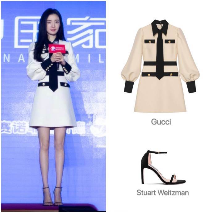 楊冪一身穿淺色連衣裙造型出席活動的照片引發了網友們的熱議。照片中她身穿Gucci連衣短裙,搭配Stuart weitzman細跟高跟單鞋,大秀美腿,看上去既知性端莊又透出一股少女氣息。