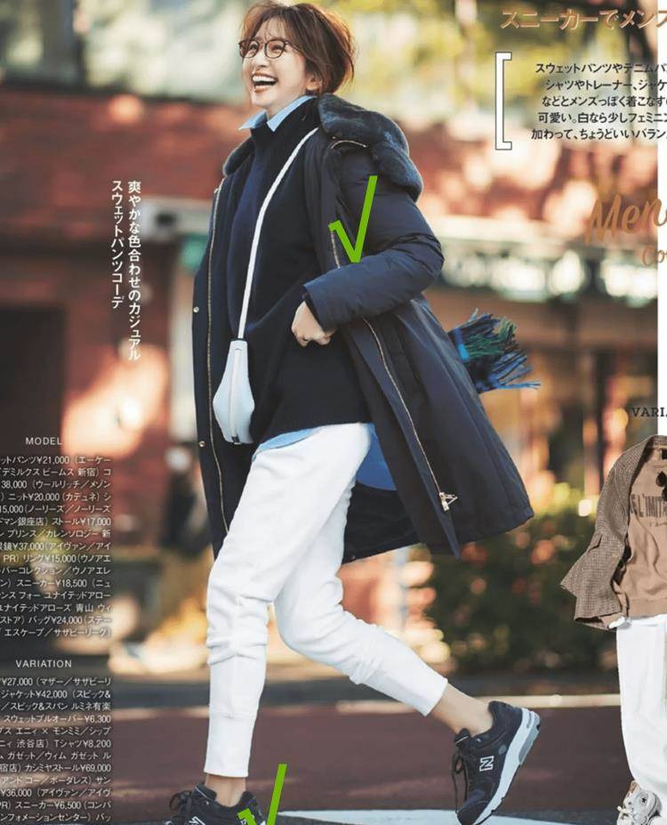 相比起彈力比較小的小腳褲,如果要對有粗腿問題的身材更具有包容性,建議選擇鯊魚褲這種帶有彈力設計的褲子,彈性好穿著也舒服,搭配長筒靴貼合度也很高,沒有擠壓感,在派克服的寬松感襯托下,會顯得整個人很瘦削和高挑,高矮個子都適用。