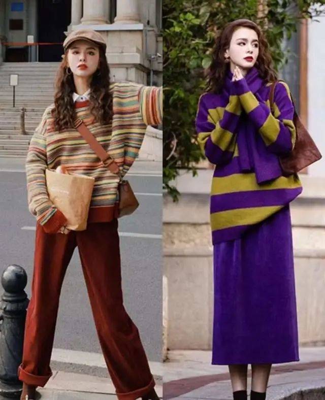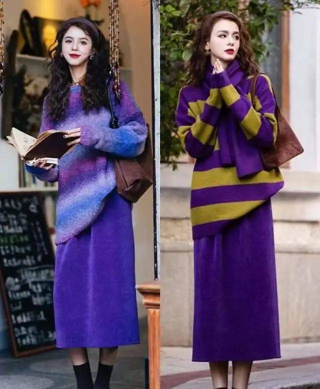 如果是膚色偏暗的女生,建議選擇飽和度低一些的顏色進行撞色搭配,比如牛油果綠色毛衣搭配暖咖色毛呢裙,配色都是低飽和度色,看起來柔和一些,不是很張揚,卻顯得精致有女人味,對膚色也不是很挑。
