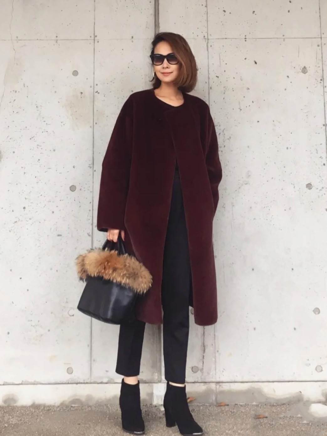 這位成熟女士採用的是顏色偏暗的紅色長大衣和黑色九分褲的配合,同樣能夠利用這種稍微瘦一點的褲管來烘托出腿型的骨感效果。尤其針對身材不那麼臃腫的人來說,這種搭配更能讓她們呈現出極為出眾的顯高顯瘦作用。