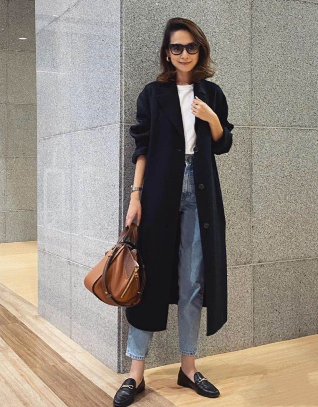 除了能夠配合灰色的九分褲以外,卡其色長大衣和牛仔褲的配合,可以同時收穫一分減齡的效果,而且牛仔褲構造出來的氛圍從來不會沉重,可以讓穿搭也顯得格外清爽。