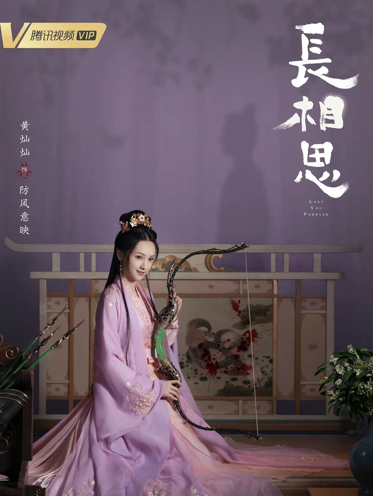 海報中的黃燦燦,身著紫色衣服,手持彎弓,低眉垂目,看起來溫柔端莊,清新俊雅。