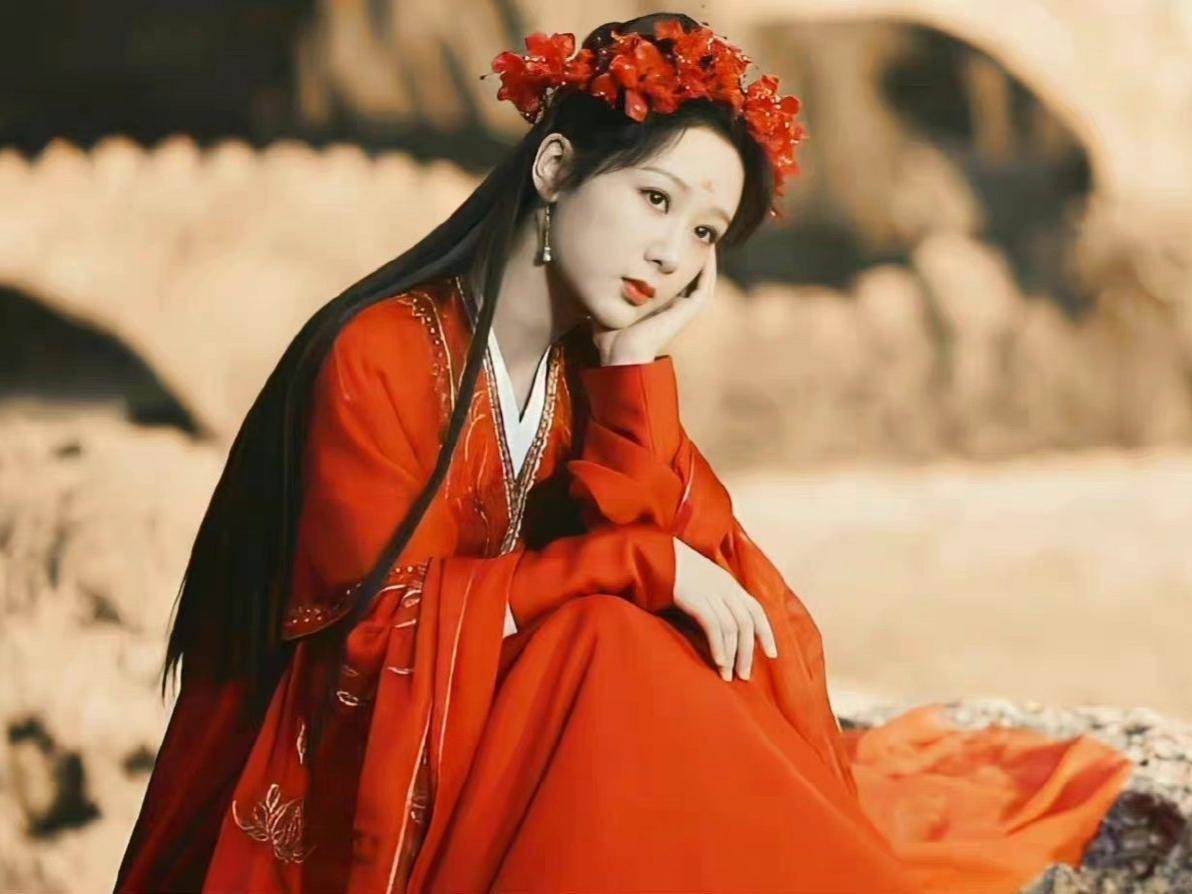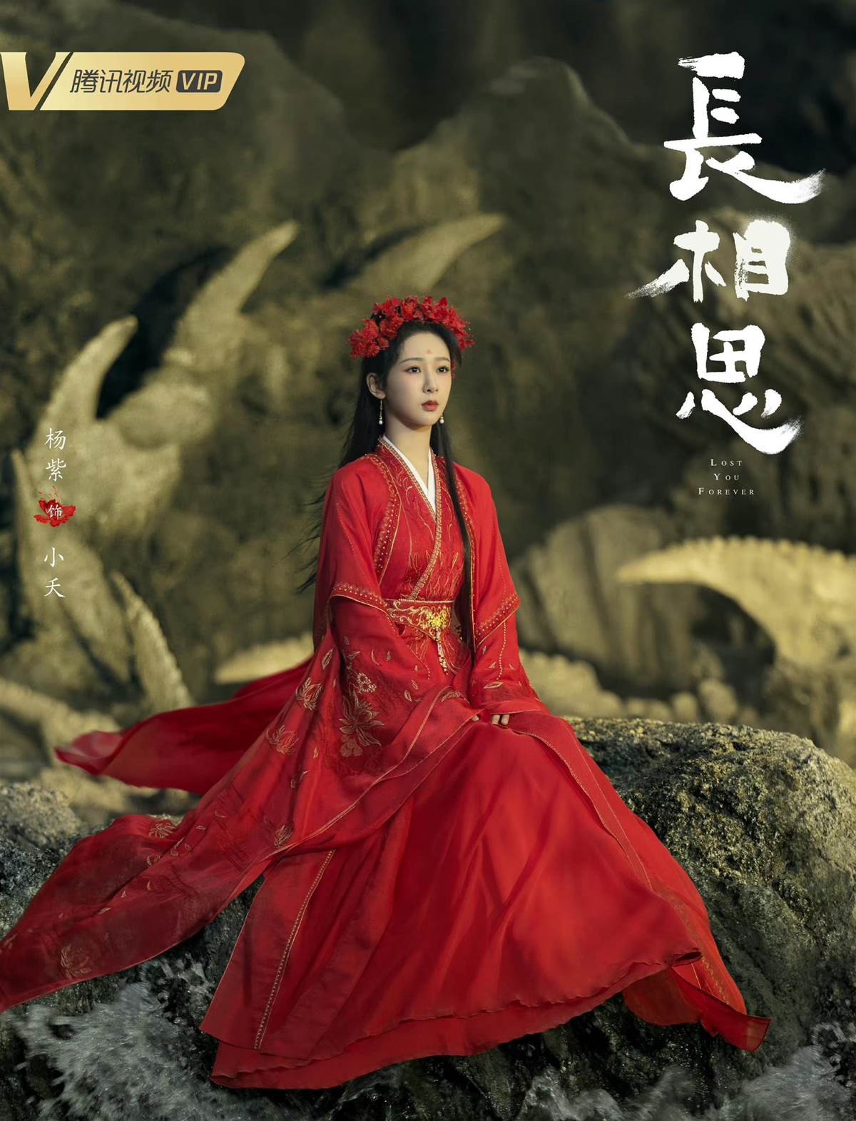楊紫分飾兩角,所以她的海報有兩張不同類型。一張是高辛王姬小夭,身穿紅色的長裙,頭戴紅色花環,坐在水邊的礁石上遙看遠方。一襲紅衣造型的楊紫甚是驚艷,妥妥的美人。