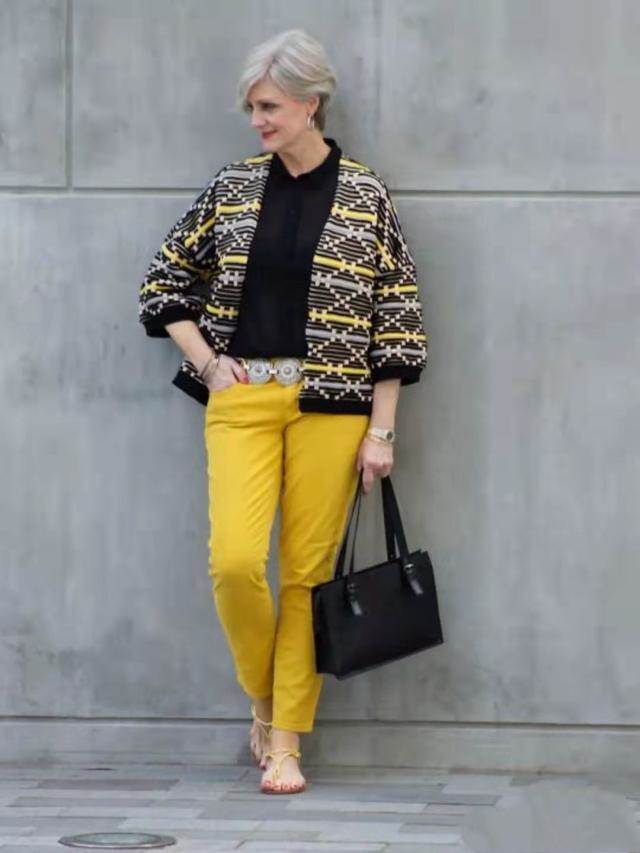 很多人喜歡黑色的穿搭是因為不用擔心配色的問題,而亮色的搭配難度相對較大,這時,最簡單的方式就是記住呼應法則。比如這身造型。上衣與褲裝都有黃色的元素,上下呼應,既協調又亮眼。