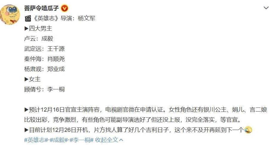 網上有消息說官方將會在12月16日官宣陣容,暫定12月26日開機。