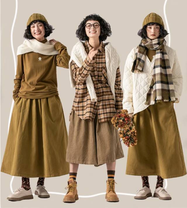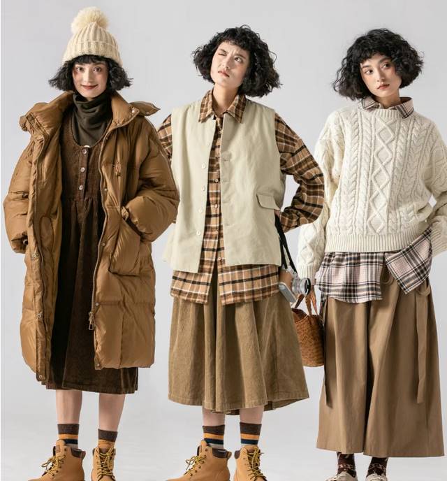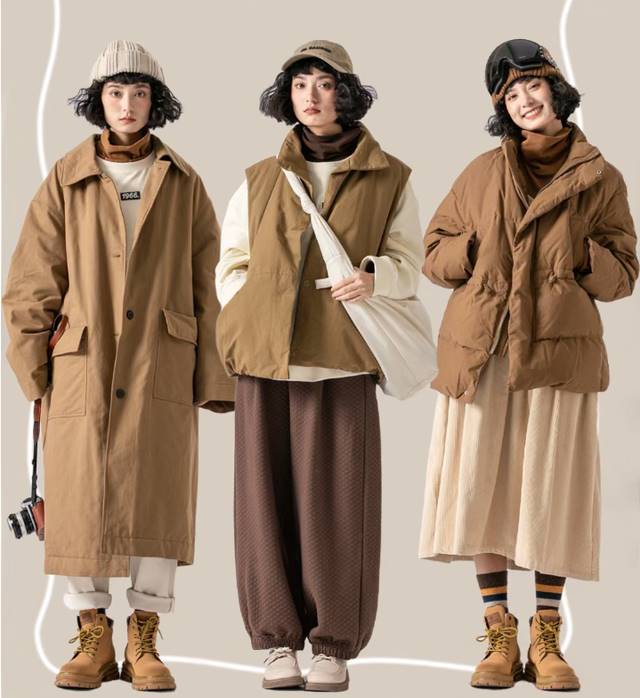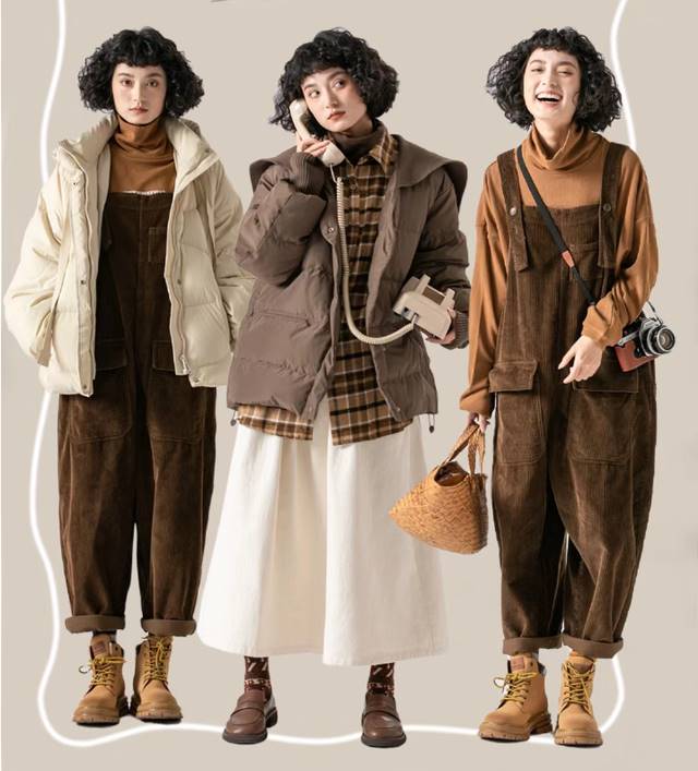 比如淺駝色的堆領針織衫搭配深駝色的背帶褲,同色系的搭配看起來又暖又顯高,外面套一件溫暖的米色面包棉服,可愛減齡的效果就達到了。