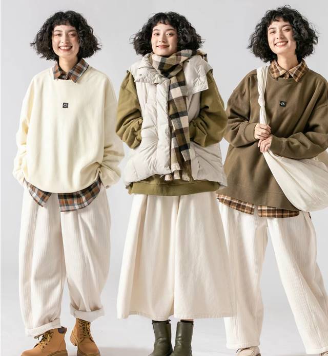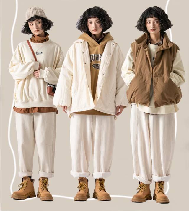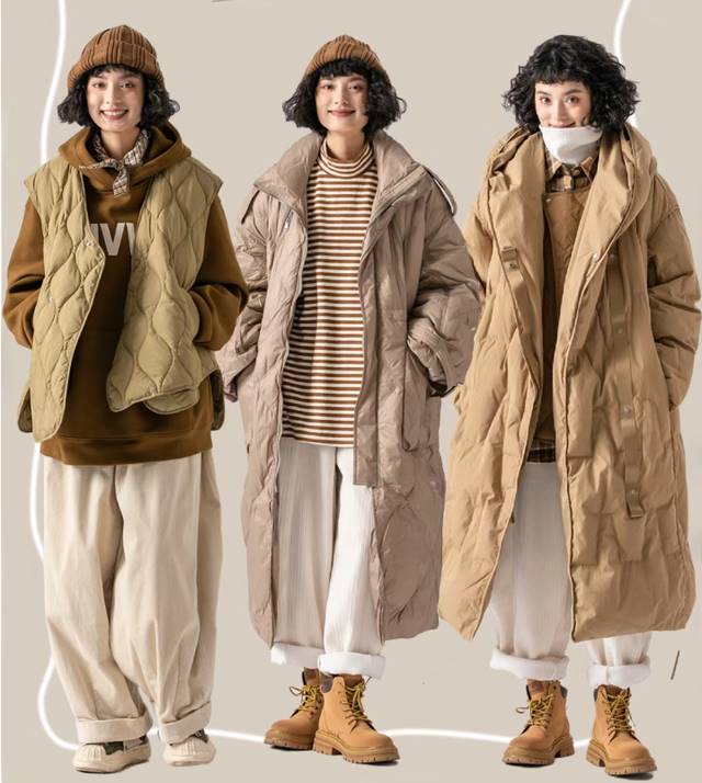 軍綠色衛衣疊穿米色羽絨馬甲,配色清新自然,很舒服的休閑風格,適合過年度假時穿,搭配米色的闊腿褲,又輕盈又軟萌的造型,就像鄰家女孩一樣,讓人覺得親切自然。