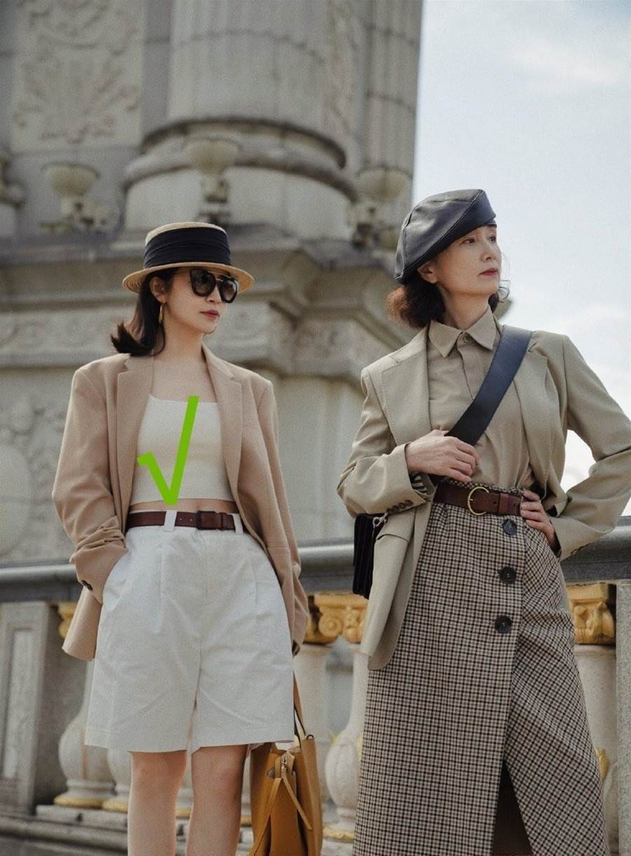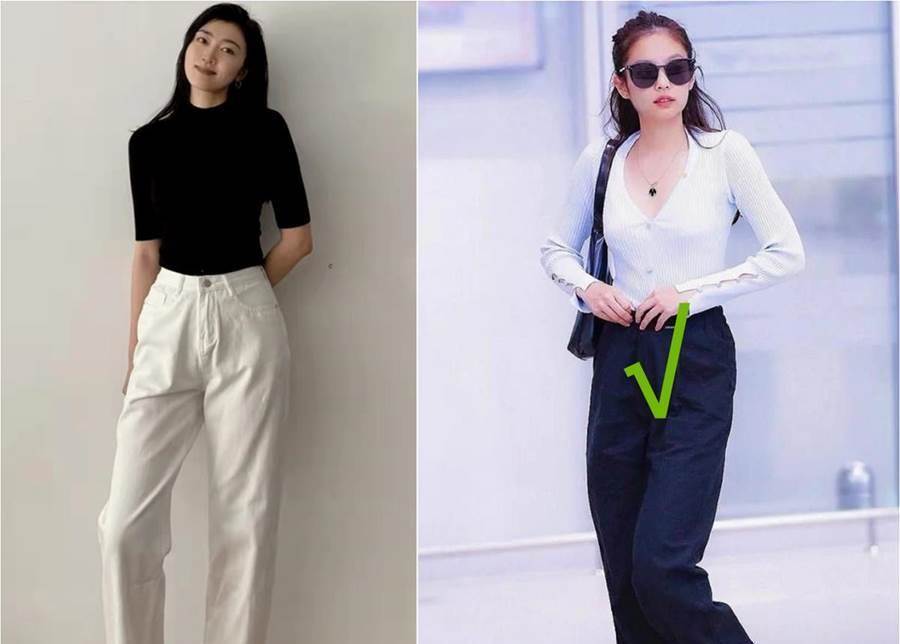 對比圖就能看出,上深下淺的穿法,會形成很強烈的視覺反差,顯得下半身更粗更壯;而上淺下深的穿法,給人的第一感覺會顯得氣質很清新舒服,并且下半身的深色影響了視覺判斷,會比實際更顯瘦,身材整體看上去更好。