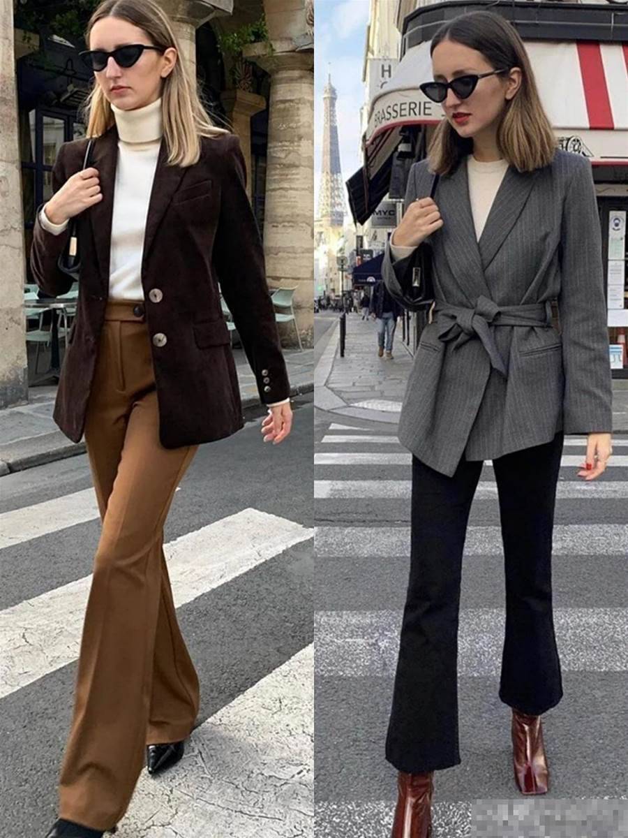 作為內搭也是吸晴,外套可以pick西裝外套的款式,選擇那種版型效果比較明顯的廓形感或者學院風格的格紋,增強服飾的精致度,和茶杯褲搭配起來也不會顯得過于單調,剛好能與內搭是襯衫的單品相襯,通勤裝穿搭首選。