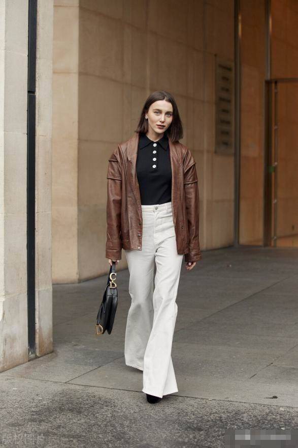 隨意套上一件帥氣的皮衣外套,氛圍感拉滿,而且巨顯瘦,皮衣的材質比較硬朗,對身材的包容性也很廣,與茶杯褲的配合恰到好處。